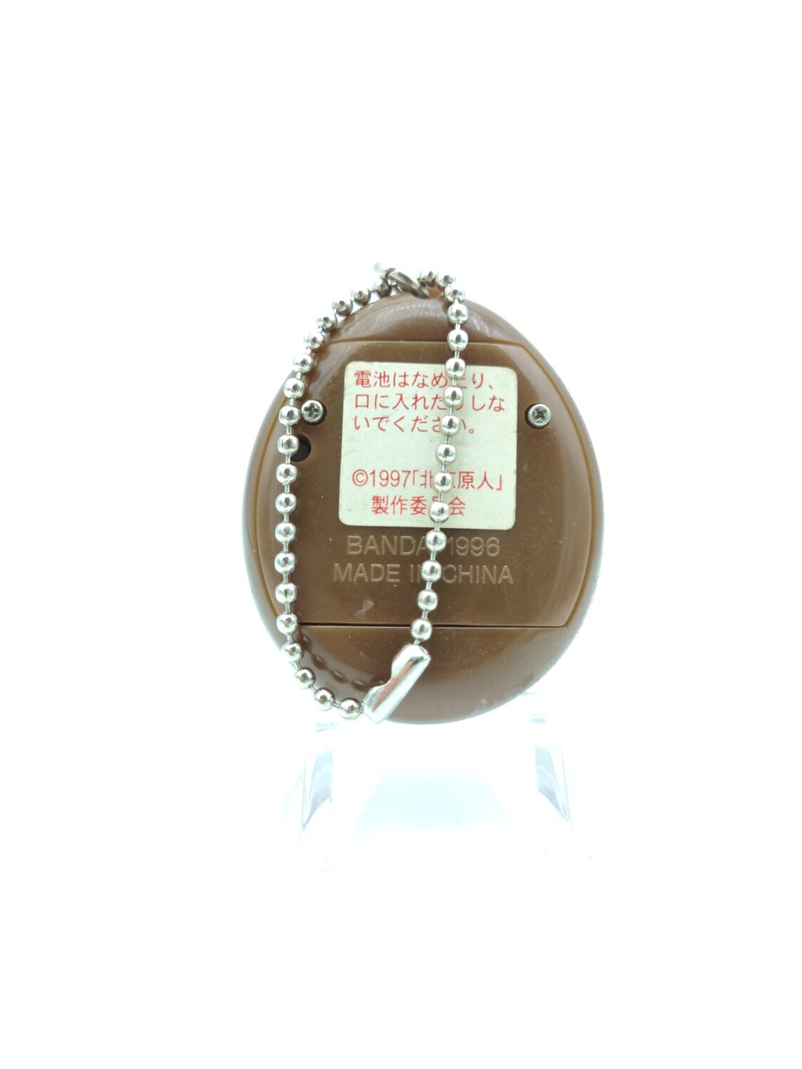 Le Genjintch se distingue par sa coque marron chocolat distinctive ornée de neuf os blancs disposés artistiquement autour de l’écran. Un os particulièrement imposant trône au sommet de l’appareil, créant une esthétique préhistorique immédiatement reconnaissable. Cette conception visuelle unique reflète parfaitement l’univers des hommes des cavernes et constitue un design iconique dans l’histoire des Tamagotchi vintage.